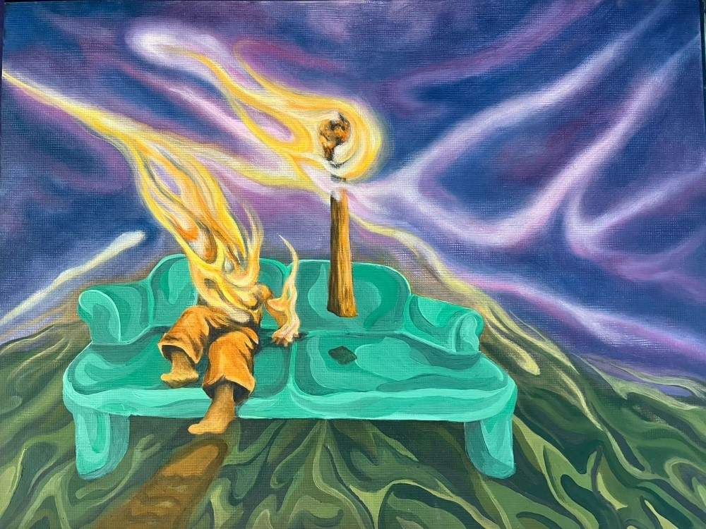 Sostiene que en las obras de Calvo lo invisible se hace presente, lo surreal se materializa, y el humo, etéreo y fluctuante, se transforma en lienzos de colores vibrantes, pues lo efímero deja de ser pasajero para convertirse en un eco persistente, un recordatorio ardiente de la conexión con aquello que transforma, consume y da vida: el fuego.