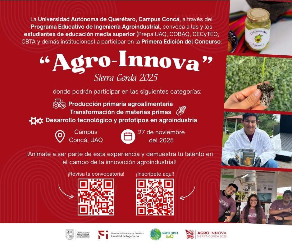 La Universidad Autónoma de Querétaro (UAQ) —a través de la Facultad de Ingeniería y la Coordinación de Ingeniería Agroindustrial del campus Concá— presentó la convocatoria “Agro-Innova Sierra Gorda 2025”, un concurso estudiantil que tiene como objetivo fomentar el talento juvenil y fortalecer la innovación agroindustrial en la región serrana y la Huasteca.