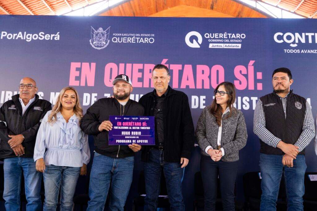 Por su parte, la secretaria de Turismo, Adriana Vega Vázquez Mellado, informó que con una inversión superior a nueve millones de pesos se benefició a 121 personas del sector turístico, entre hoteleros, restauranteros, guías, artesanas, artesanos y pequeños comercios. Además, se entregaron carritos para la venta de productos y artesanías con una inversión de 3.4 millones de pesos, en apoyo a 51 familias de distintos municipios de la Sierra Gorda.