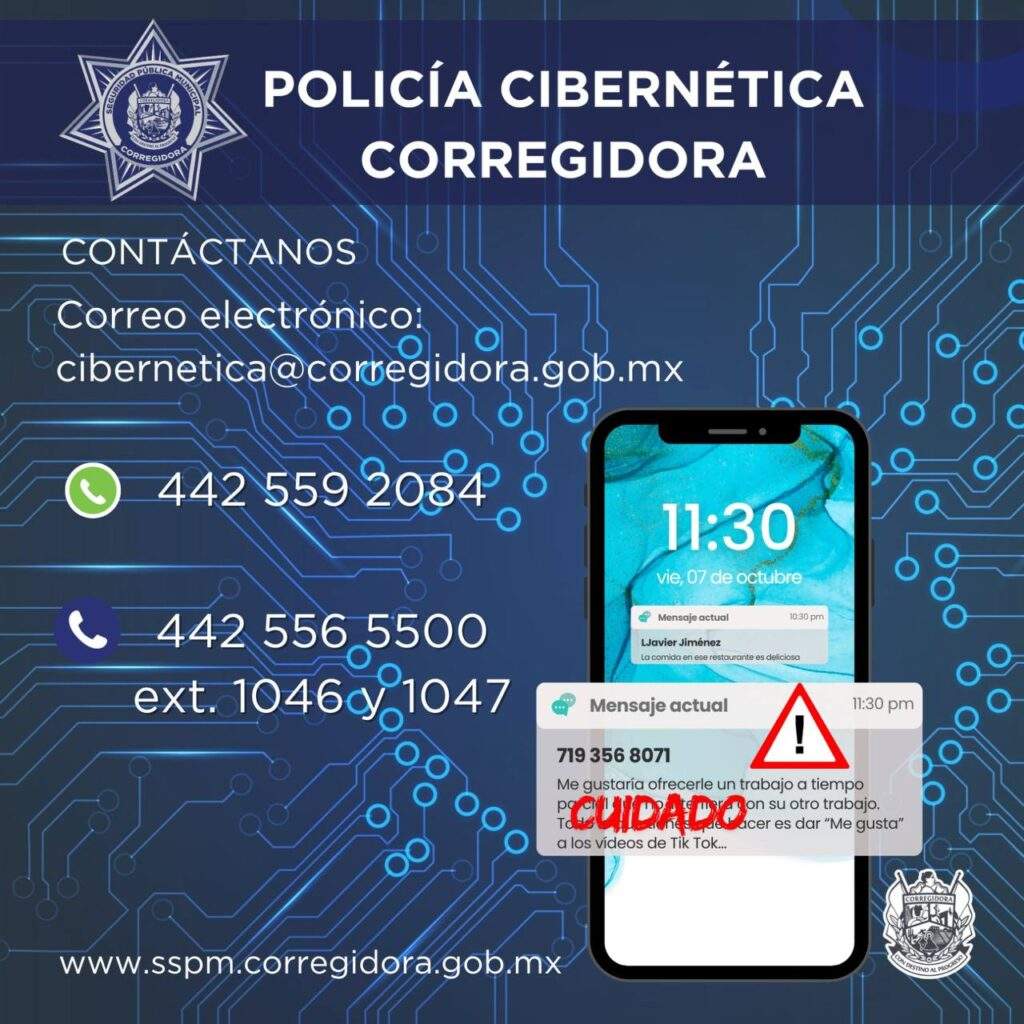 “Recuerda que, ante cualquier situación sospechosa, pueden comunicarse directamente con la Policía Cibernética del Municipio de Corregidora, para recibir apoyo inmediato al número de WhatsApp 442 559 2084”, señaló.